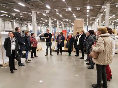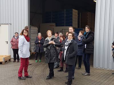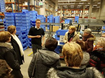 Herr Börger, Projektleiter Intralogistik, führte die Damengruppe durch die neuen Logistikhallen. Logistik bedeutet hier nicht nur Palette neben Palette sondern auch modernste Kommissionierung und Automatisierung.